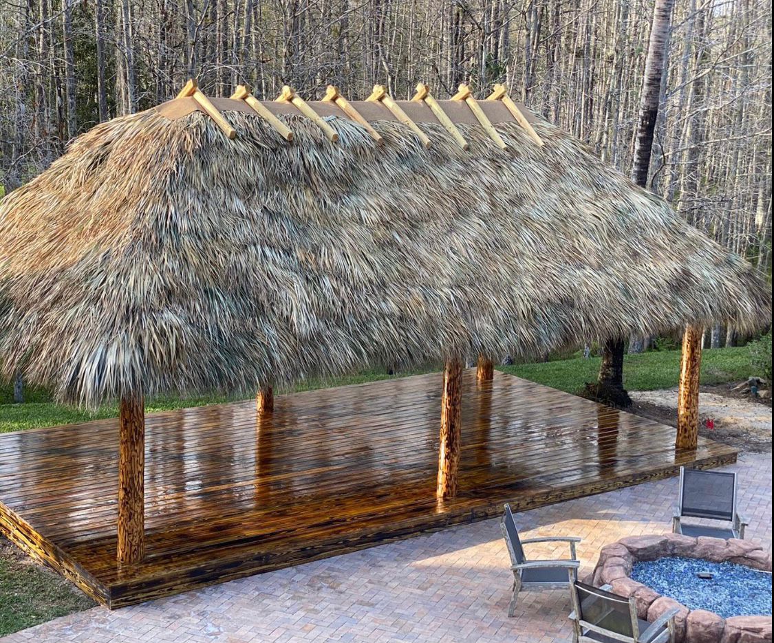 Authentic palm-thatched roofing engineered for durability and natural ventilation.